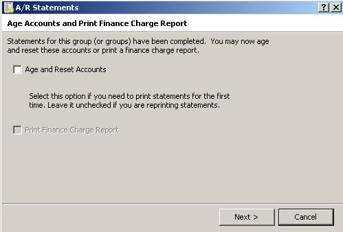 8. Type alternate information if needed and click Next. Statements print and the Age Accounts and Print Finance Charge Report prompt displays: