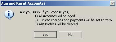10. Click Yes and payments and credits are subtracted from the oldest balance on the customer accounts. Current charges are moved to the 0-30 ageing bucket and all other balances are moved to their next respective bucket. The Patient Record displays 0.00 in the current charges and payments field. Click No if there are statement printing errors. Balances are not adjusted until the A/R File Compression is completed.