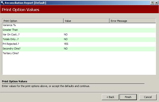 Variance %: Type a variance percentage. For example, to print a report for claims with a variance of 5% or more type .05.