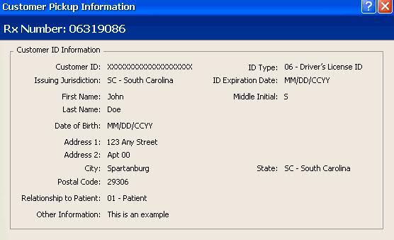 When identification is processed for a customer picking up a controlled substance prescription, the identification information automatically populates on the Transaction Record for that prescription.
