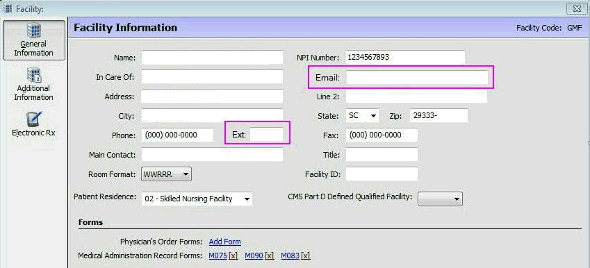 Added fields, Phone Ext and Email address, to the Facility Record as well as Systems Utilities/Data Updates/Electronic Data Updates/Set Up Facility Options. Default = Blank.