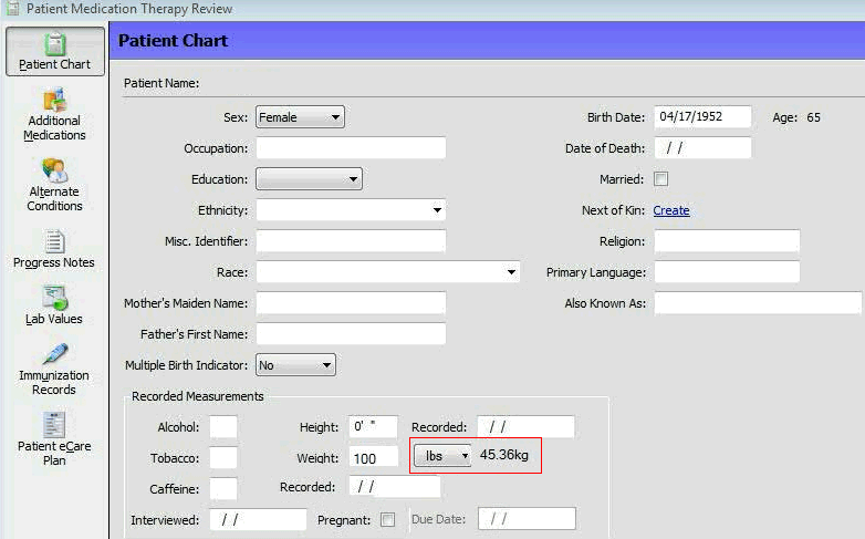 Added a drop-down menu with options for lbs and kgs to the Patient Chart. If lbs is chosen, the translation in kgs is posted to the right. Updated the options within Batch Record Updates for the Patient File.