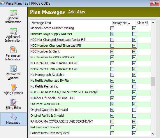 Added a message, NDC Number Changed Since Last Partial Fill, to Price Plan Messages. Default = Display: Unchecked, Allow Fill: Checked. When being used, this message displays if the most recent Transaction in the Rx History was a partial fill, and the Qty Dispensed was less than the Qty Authorized and another partial fill is attempted with a different NDC.