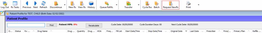 Added a button, Request NewRx, to the Patient Rx Profile. To use, the Security Access option, NewRxRequest, must be selected. Click to view the NewRxRequest screen.