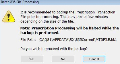 Added an option, Batch 835 Reconciliation, to System Utilities/Reconciliation. Under this option are two sub menus; Process 835 Files and Archived 835 Files. Click Process 835 files to access the Batch Process 835 Files screen to begin the Batch 835 Reconciliation process. The files from the 835 Current folder display, along with # of Claims, Amount Paid, Payment Method, Paid Date, Payer Name, and Price Plan Group Name. Select the box next to the files to process. Use the Price Plan Group Name column to select the Price Plan Group Name to associate with the 835 to process reversals. Click the Select All button if you want to process all files. Once ready, click Process to begin. A backup prompt displays. A Transaction File backup is highly recommended. Click Yes if okay with prescription processing being interrupted to proceed with a backup of the Prescription Transaction File. Time varies depending on the size of your Transaction File. Click No to bypass the backup and continue with the batch. Click Cancel to perform the batch later. The system matches the Primary, Secondary, and Tertiary Paid Amounts in the 835 file with the claims based on Rx # and Date Filled on the Transaction for posting payments and adjustments of claims. For reversals, posting requires an additional match of the Transaction Price Plan in the Price Plan Group associated with the file and the paid amount.