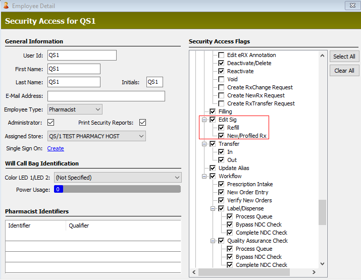 Added a Security Access Flag, Edit SIG, under Prescription Access with sub-flags Refill and New/Profiled Rx. Both default to checked which allow a change to a SIG on any prescription.