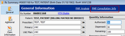 Added a link, PMP Consultation Info, to the Transaction > Additional Information screen. Click to access the PMP Consultation Info screen for the following: Patient Name, Drug Name, Rx Number, and a Consulted PMP detail grid.