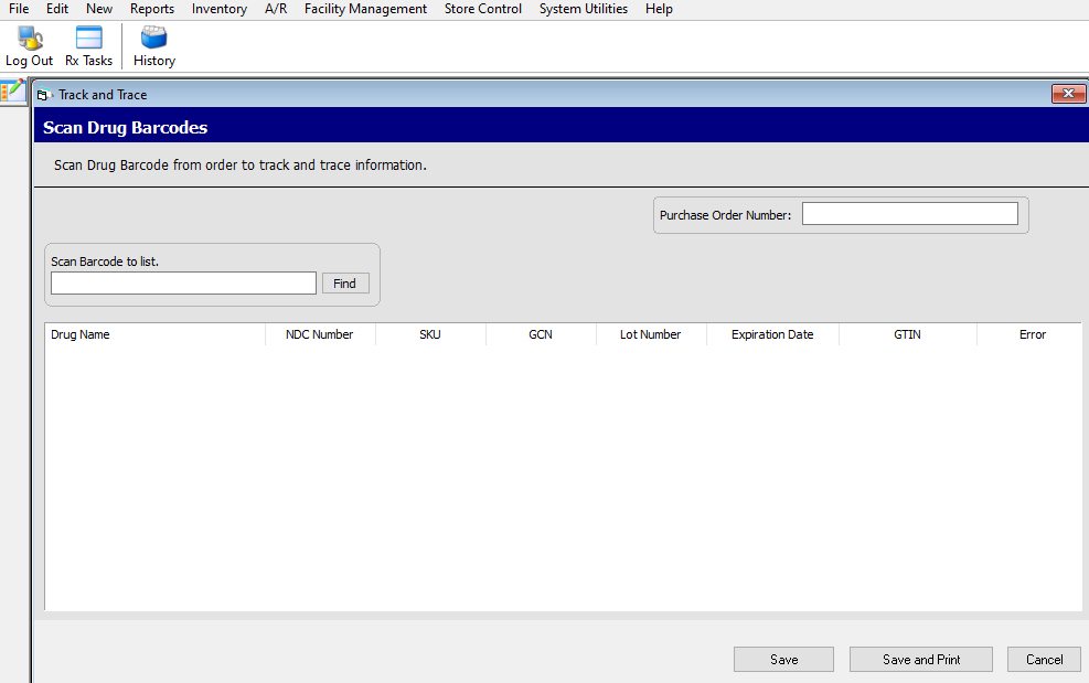 Added an option, Track and Trace Log, to Inventory > Electronic Drug Reorder. Select to access the Track and Trace screen. Enter a Purchase Order Number or scan the 2D barcode on the drug stock bottle to populate the details. A red X displays in the error columns if any of the columns are blank. Select Save to save as a .csv file or Save and Print to save as a .csv file and print as a hard copy. Select the History button at the top of the screen to access saved logs.