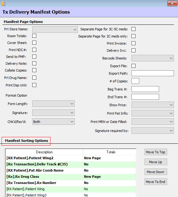 Removed the option, Export File, from Facility Management > Facility/Unit Record Management > Delivery Information > Workflow Delivery Manifest Options Manifest Page Options. The system uses the Export Path for this function instead. If Export Path is left blank, the system translates the Export File = NO. If the field is not left blank, the system translates the Export File = YES.
