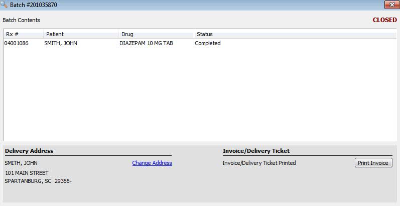 Automatic and manual batching programs save the delivery method and delivery address on batch records when a prescription is filled. If the delivery method for the prescription does not match the selected delivery method for the batch, a message displays giving the customer the option to use the order method or the prescription method for all prescriptions in the order. If the delivery method for the prescription is blank, the order method is automatically used.