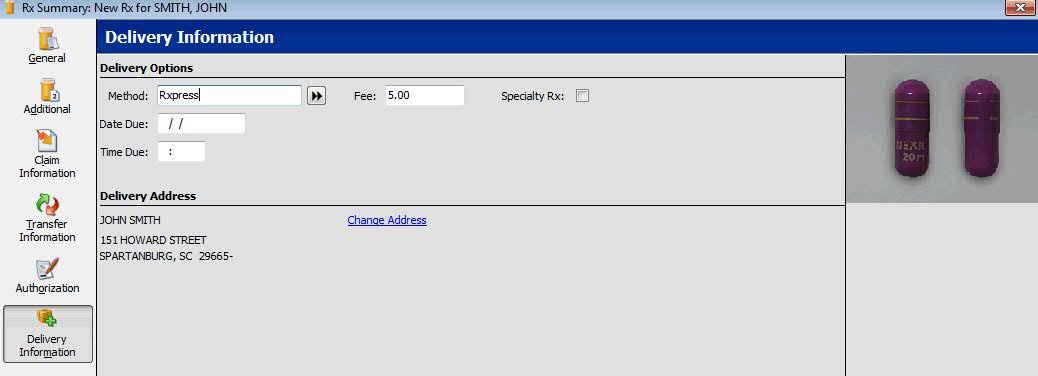 When a new prescription is entered, or a prescription is selected from the patient profile, the delivery address defaults from the patient or head of household.