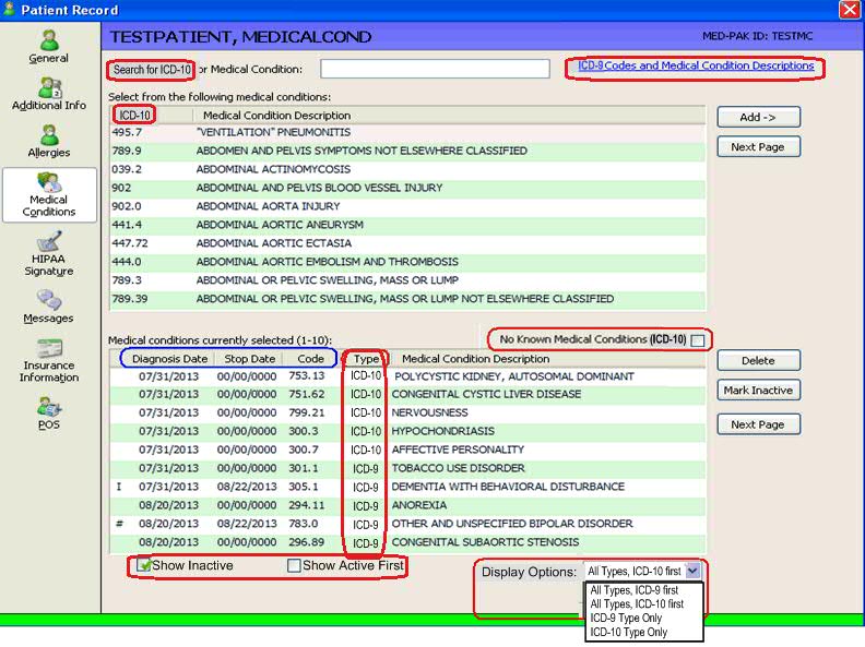 The Patient Record Medical Conditions screen incorporates new fields and functionality for ICD-10 Codes. Changes include: