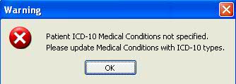When the Patient Record is accessed and the clinical checking option above (Display Warning if Patient ICD-10 is Blank) = Y, a warning displays when ONLY ICD-9 Medical Conditions exist for the patient. This message continues to display until an ICD-10 Code is added to the Patient Record, Medical Conditions screen.