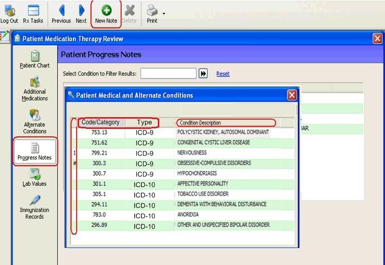The Patient Chart Progress Notes screen displays updated Patient Medical and Alternate Conditions when New Note is selected from Patient Progress Notes. Before October 2014, ICD-9 Codes display first, then ICD-10 Codes. After October 2014, ICD-10 Codes display first, then ICD-9 Codes.